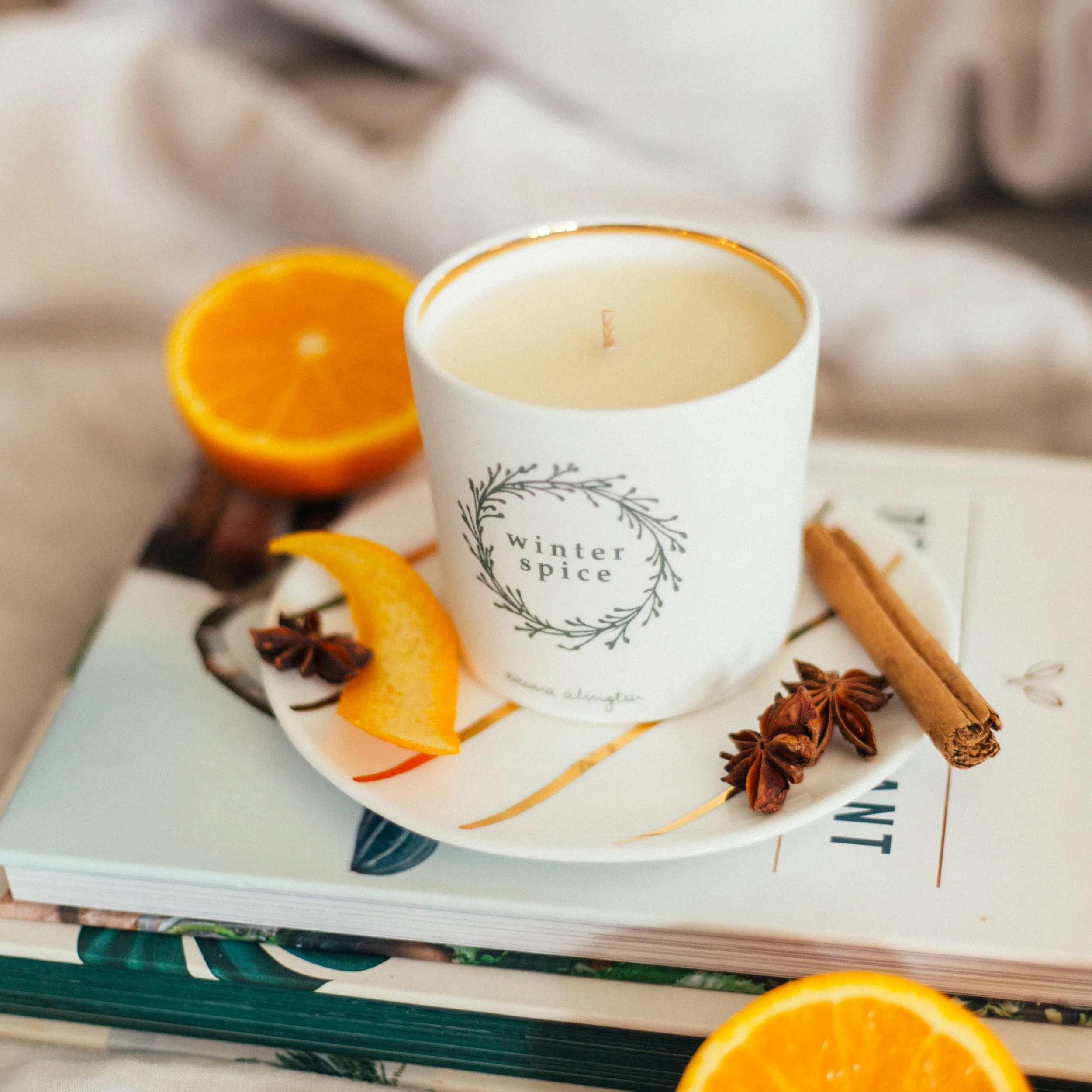Indulge in our luxurious Winter Spice scented candle. Enjoy nostalgic notes of festive spices, fragrant orange and pomegranate, with a subtle kick of sandalwood, creating a warm, inviting fragrance on a cold winter’s day.